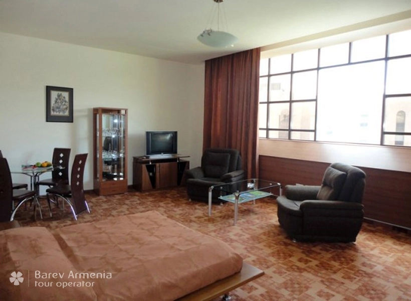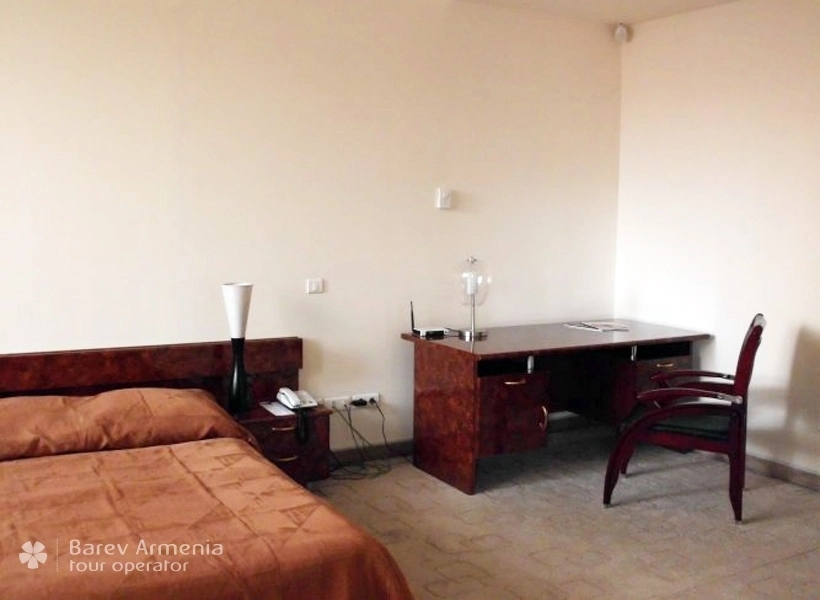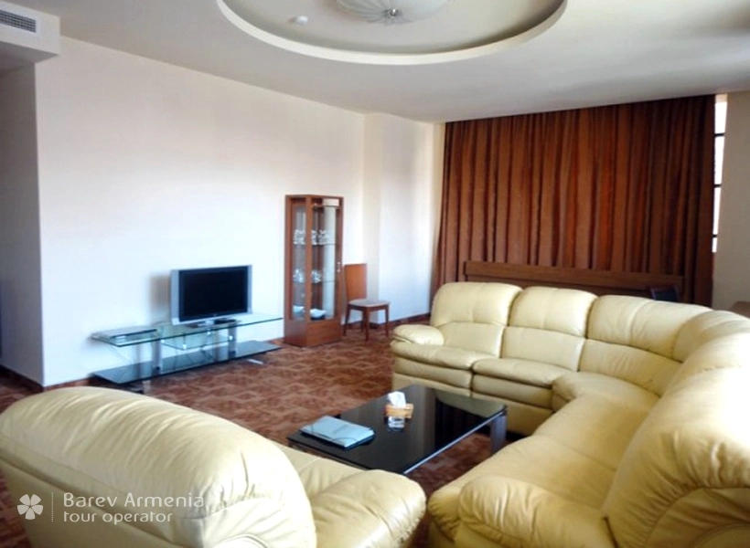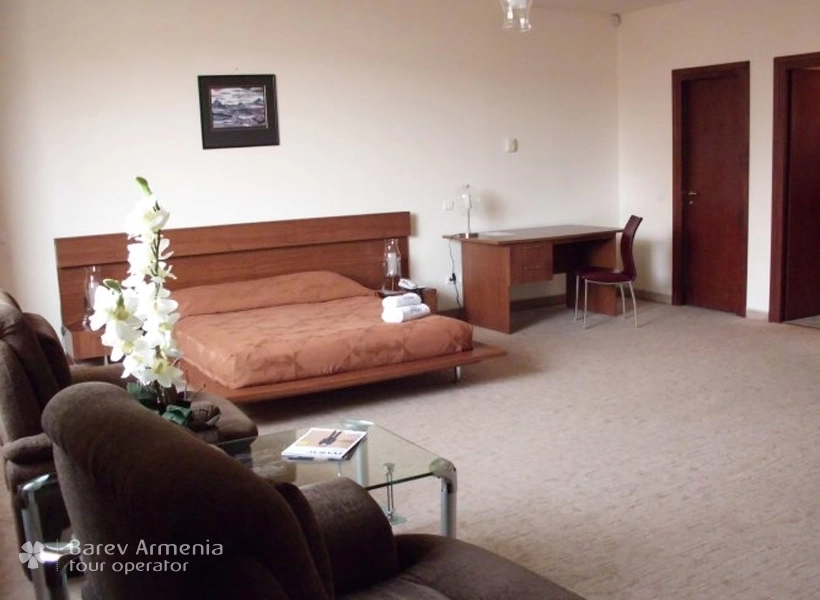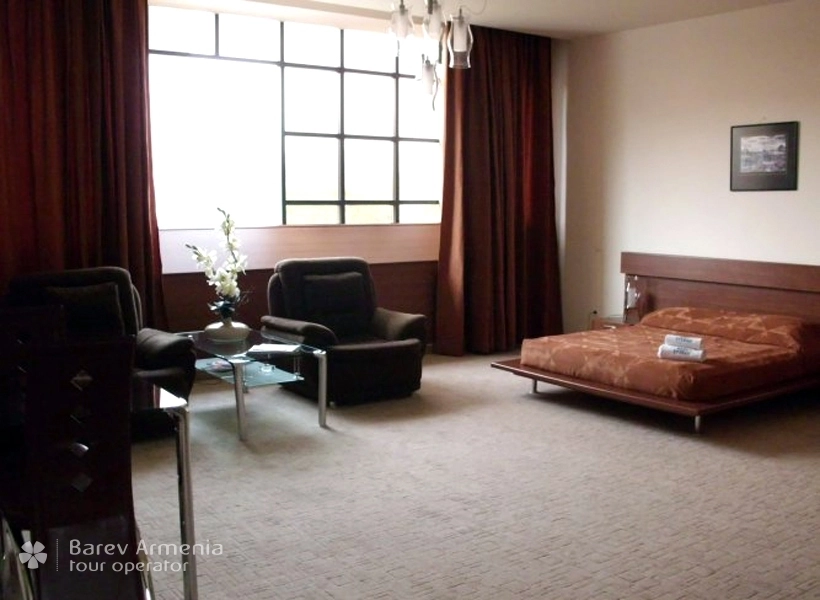 комната, ванна, умывальник, туалет, фен, местные телеканалы, спутниковые телеканалы, телефон, зеркало, стол, рабочий стол, журнальный столик, гардероб, стул, кресло, диван, мини-бар.
