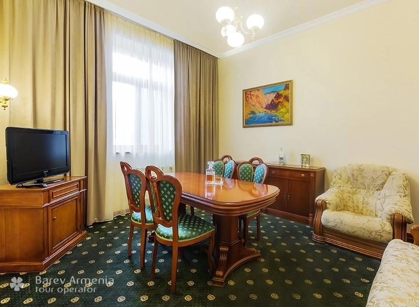 Люкс номера 1 категории двухкомнатные – гостиная и спальня. В спальне большая кровать, шкаф, тумбочки, в гостиной — раскладной диван, кресла, журнальный стол, большой стол с шести стульями. Номера имеют 2 санузла.