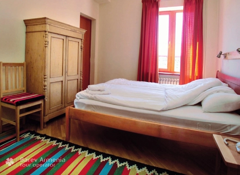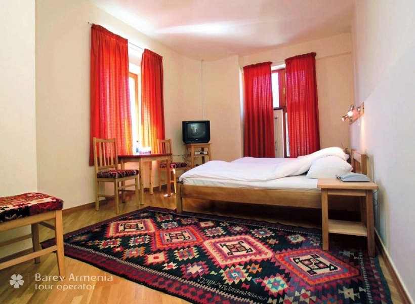 Одна большая или две осноместные кровати, гардероб, ящики, стол, кабельное телевидение, ванная с душом.