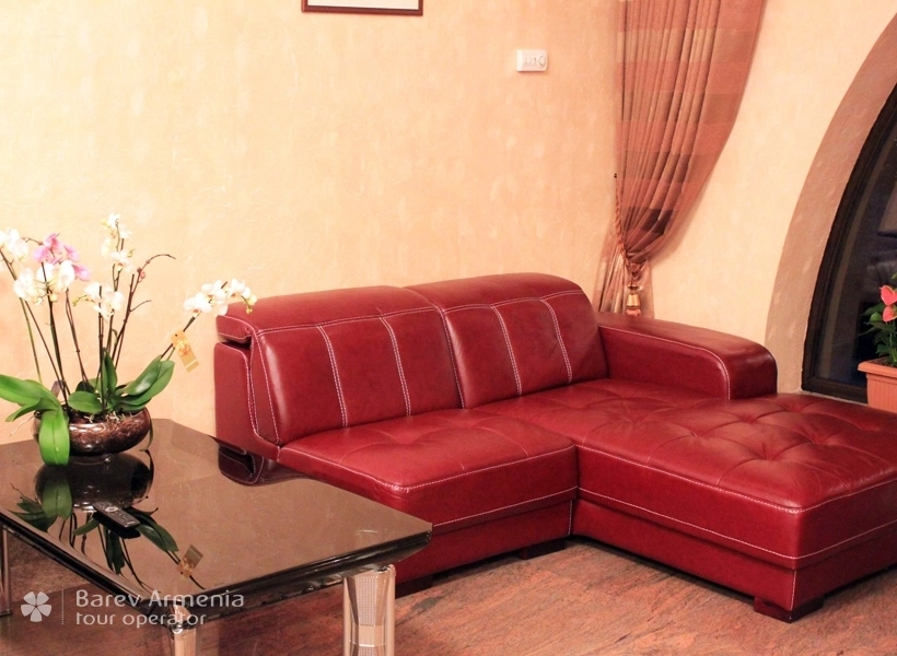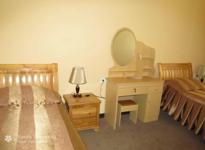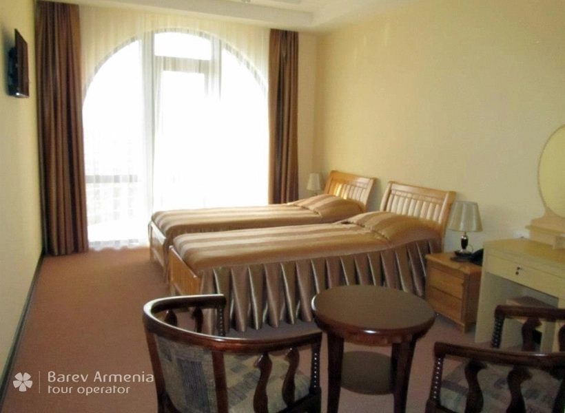 В номере есть кондиционер с индивидуальной системой регулирования температуры, шкафы, лампы, столы, стулья, телефон, телевизор с местными и спутниковыми