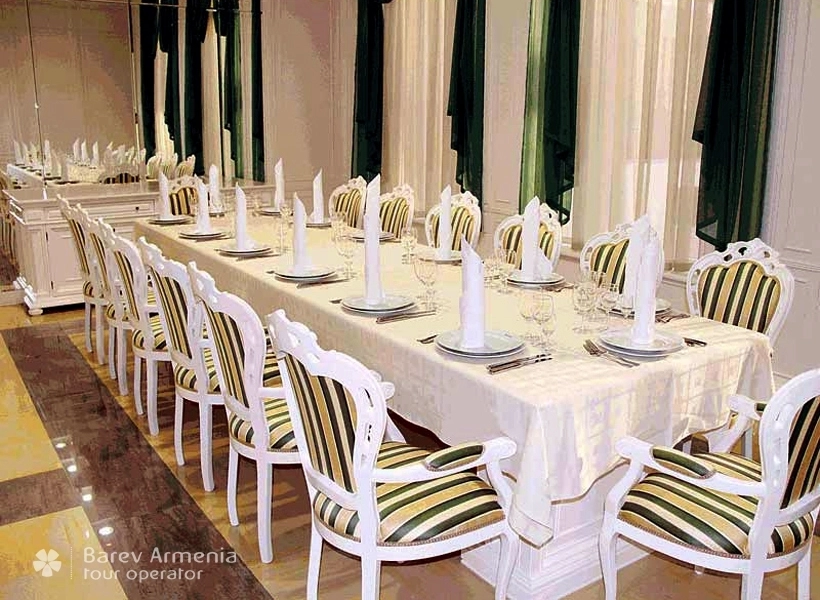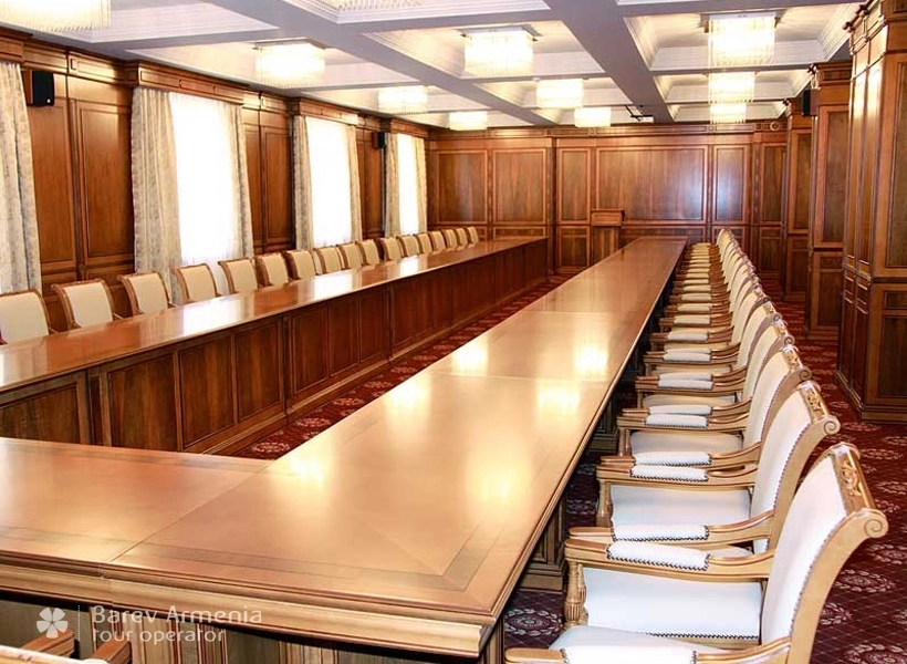 Специальное помещение оборудованное для проведения конференций и семминаров, предназначено для проведения мероприятий с колличеством людей от 50 до 70 человек. Комната оснащена профессиональным кинопроектором и экраном, а также тремя отдельными кабинами для синхронного перевода. Комната шумоизолирована. Имеется свой отдельный санузел.