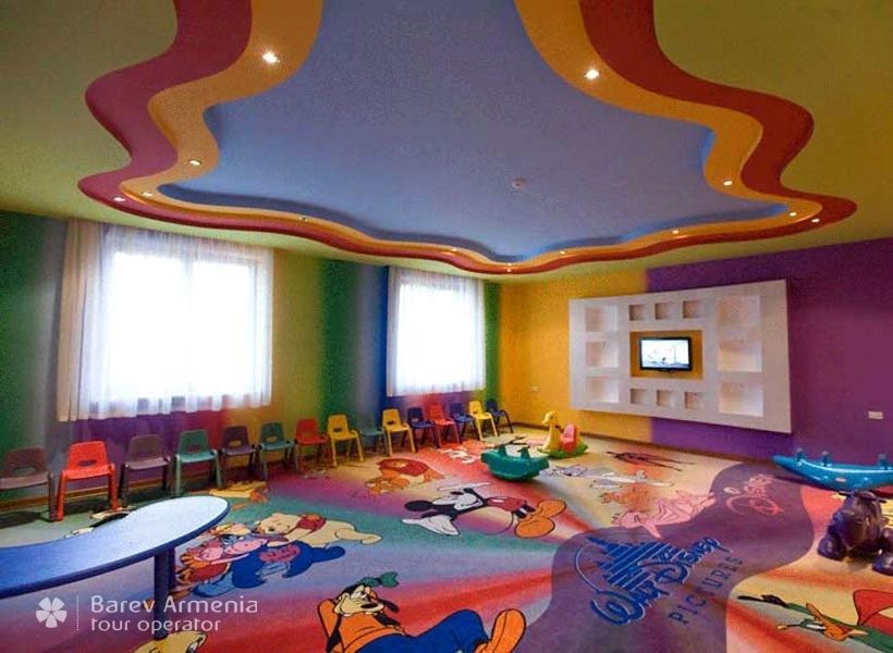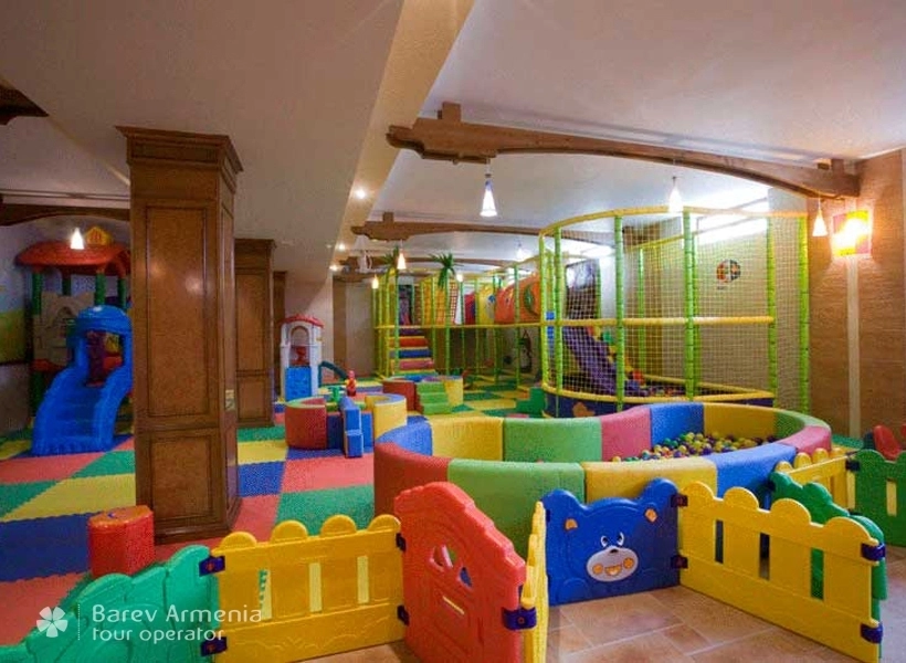 На территории гостиницы действует специальный зал предназначенный для развлечения детей. Он оборудован специальными игровыми площадками, такими как лабиринт, домики, горки бассейны с шариками и т.д. Также имеются детские компьютерные и игровые автоматы, столы для настольного тенниса. И конечно же за Вашими детьми будет следить очень внимательная и отзывчивая нянька.