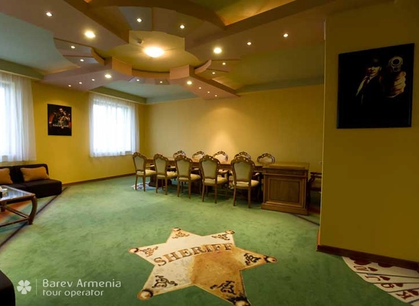 Отдельная комната для любителей популярной игры “МАФИЯ”. Комната оборудована специальным игровым столом со стульями, имеется весь необходимый инвентарь (специальные игровые карты, магнитофон, маски), также предусмотрен мягкий холл для выбывших из игры участников.