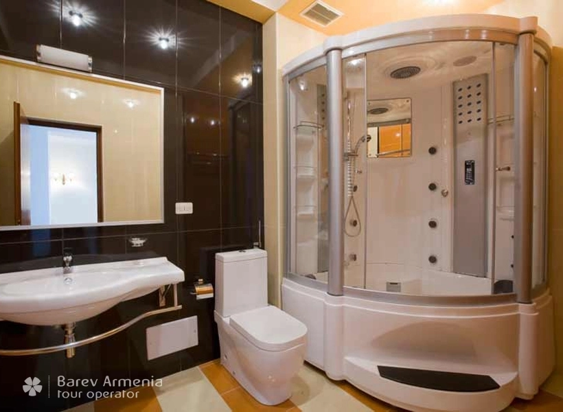 Гордость нашего комплекса – самые роскошные номера предусмотренные, на 4-х человек. Огромная гостевая комната оборудована мягким холлом, гостиным столом, а также рабочий кабинет стол с отдельным освещением. Две отдельные спальни с двуспальными кроватями, одна из спален мебилирована полностью в белом цвете, что еще раз подчеркивает особую роскошность данных номеров. Для большего удобства кроме отдельных двух душевых кабин-джакузи номер оборудован отдельным санузлом для гостей. В номере имеется трюмо, бельевой шкаф, несгораемый сейф, спутниковое телевидение, бесплатный Wi-Fi интернет, внутренний телефон. Все номера оборудованы электронными дверями (система электронная карта-ключ) Также в номере имеется мини-бар. В ванных комнатах имеются душевые кабины с круглосуточной горячей и холодной водой, одноразовыми туалетными и ванными принадлежностями, также в данном номере предоставляются халаты.