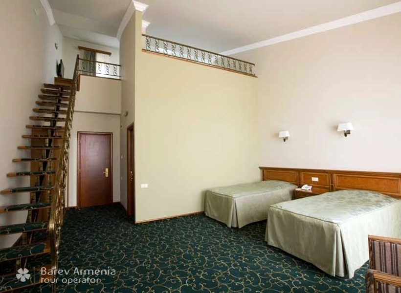 Очень удобный двухэтажный номер предусмотренный для 4-х человек. На первом этаже этого номера имеются две отдельные кровати, а второй этаж оснащен одной двуспальной кроватью. В номере имеется два мягких кресла, журнальный стол, трюмо, бельевой шкаф, несгораемый сейф, спутниковое телевидение, бесплатный Wi-Fi интернет, внутренний телефон. Все номера оборудованы электронными дверями (система электронная карта-ключ) Также в номере имеется мини-бар. В ванных комнатах имеются душевые кабины с круглосуточной горячей и холодной водой, одноразовыми туалетными и ванными принадлежностями