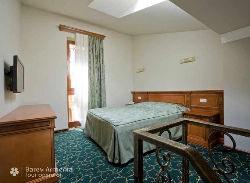 Номер ДеЛюкс предназначен для 2-х человек, оборудован одной двуспальной кроватью, с просторной гостевой комнатой в которой имеется мягкий холл и гостинный стол с 4-мя стульями. Этот оригинальный номер имеет открытый балкон с прекрасным видом на город Цахкадзор. В номере имеется трюмо, бельевой шкаф, несгораемый сейф, спутниковое телевидение, бесплатный Wi-Fi интернет, внутренний телефон. Номер оборудован электронной дверью (система электронная карта-ключ) Также в номере имеется мини-бар. В ванных комнатах имеются душевые кабины-джакузи с круглосуточной горячей и холодной водой, одноразовыми туалетными и ванными принадлежностями, также в данном номере предоставляются халаты