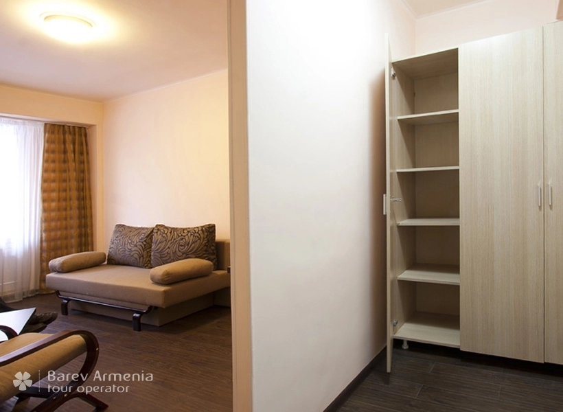 Отопление, прихожая, спальная комната, гостиная, ванная комната, душ, умывальник, туалет, местные телеканалы, спутниковые телеканалы, телефон, зеркало, рабочий стол, журнальный столик, гардероб, стул, кресло, диван, холодильник, балкон.