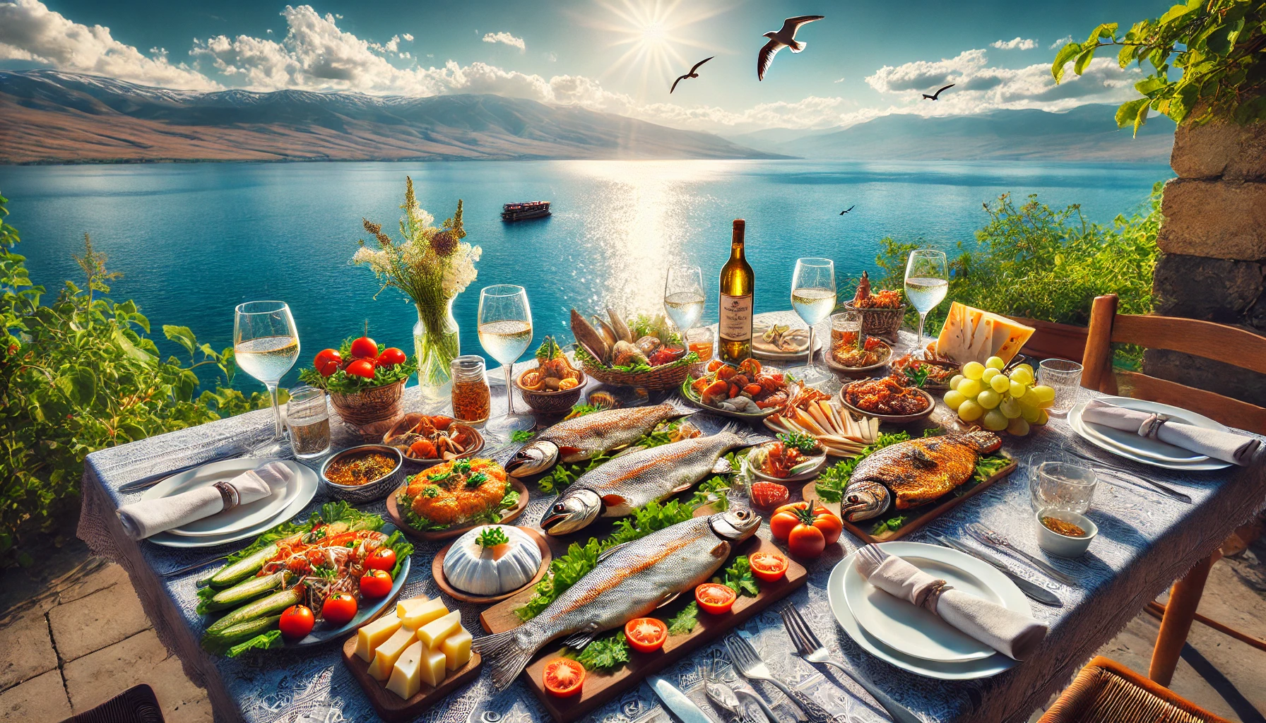 Аппетитные армянские рыбные блюда на фоне озера Севан в солнечный день. Настоящая кулинарная идиллия! 🍽🐟☀️